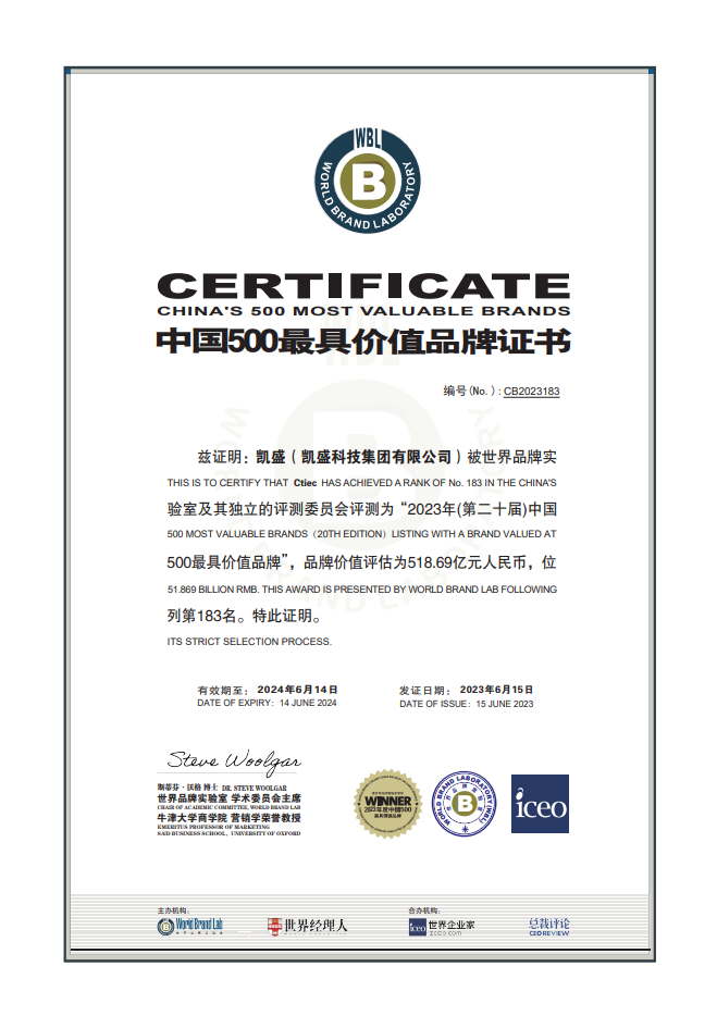 6月15日,由世界品牌實驗室(World Brand Lab)主辦的2023年“中國500最具價值品牌”發布會在北京舉行,“凱盛”品牌首次參評,即以518.69億元人民幣的品牌價值,位列榜單183位。